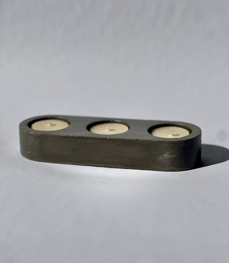 Pieza de cemento negro de 20 cm de tres velas de noche, concebida como un objeto de diseño sobrio y contemporáneo. Su presencia sólida y minimalista aporta carácter y elegancia a cualquier espacio.