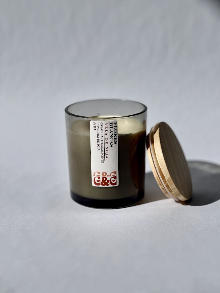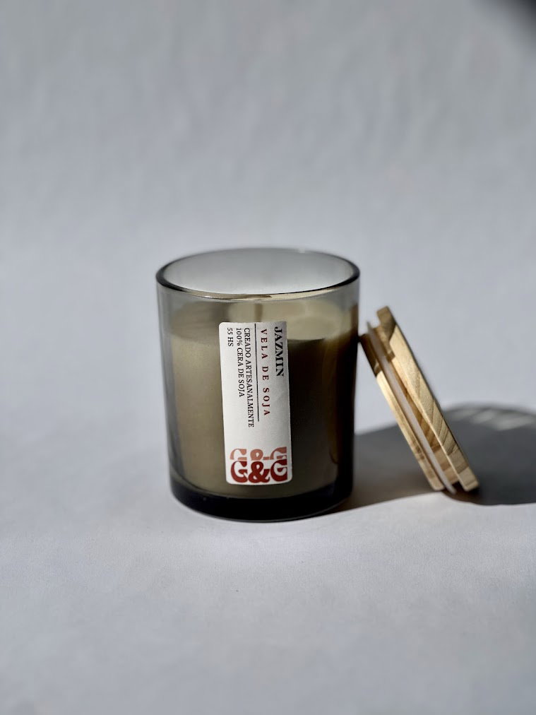 Vela de soja en vaso cilíndrico color fumé. Su tapa de pino con sello de silicona preserva la fragancia y realza un diseño cuidado y elegante.